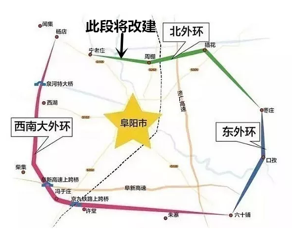 阜阳共有内环、中环、外环,外环是阜阳城市框架的最外围。阜阳外环包括西南大外环、北外环、东外环。西南大外环已建成通车。近日从市交通运输局获悉,阜阳东北大外环的重要组成部分,102省道颍泉周棚至李长营段改