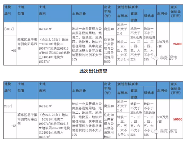 今天,阜阳市国土局再次出让颍东总干渠55号地块!上次出让信息两次信息对比,可以看到,此次保证金从5亿将到了2.5亿,减少了一半。此前国土局就发出公告,九幅地块的保证金都进行的下调!55号地块的缴款比例